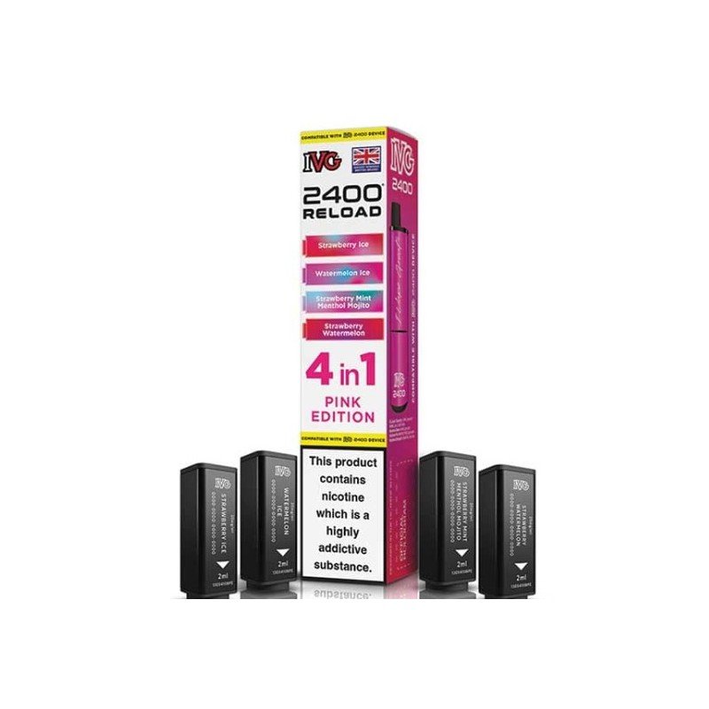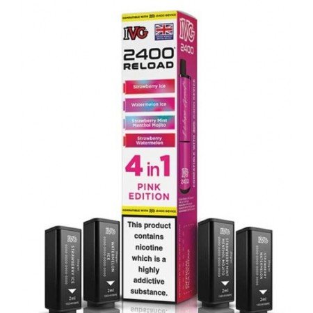 The IVG 2400 Reload 4-in-1 Pink Edition redefines convenience and variety in vaping. This innovative device houses four pre-filled 2ml pods, each delivering a unique, fruit-inspired flavour: